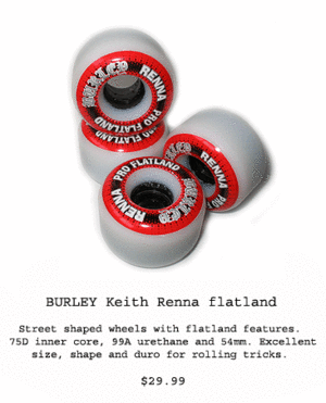 "Vince.......GREAT wheels! They are so faassst and also seem to wear less than the older Burleys I have. The BEST wheels I have been riding for the last 15 yrs. Thanks for supporting Freestyle with yet another great product !!!" YOYO December 2004
