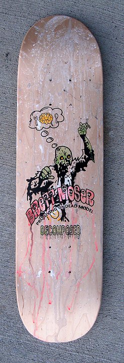 Features a menacing green zombie with yellow eyes center-board with a thought bubble reaching above with yellow brains in the center, and following proper table setting etiquette, a fork is placed on the left side and a spoon on the right. "BRETT MOSER" is written in pinkish filled black-bordered letters with "PRO LIVING UNDEAD MODEL" written in smaller black letters below. "DECOMPOSED" is written below, just above the rear truck mounting holes. Grey and Pink paint splatter and runs appear throughout.
