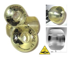 Features a skull on the left side of the wheel with "craneo de cristal" printed across the top, which means "crystal skull" in Spanish. "54MM" and "95A" appear on the right side, with "decomposed" printed in small black letters across the bottom.