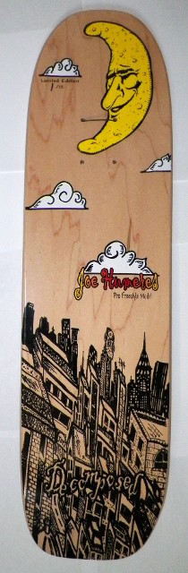 Features a black one-tone background of an urban landscape on the bottom half of the board. A large yellow waxing crescent moon with a face appears on the nose with small billowy clouds spread throughout the sky. "Limited Edition" and "/12" appears below the cloud on the nose. Joe Humeres" appears in red and yellow filled letters under a cloud in the center of the board. "Pro Freestyle Model" appears below that in black letters. The Decomposed logo appears within the city on the tail.
