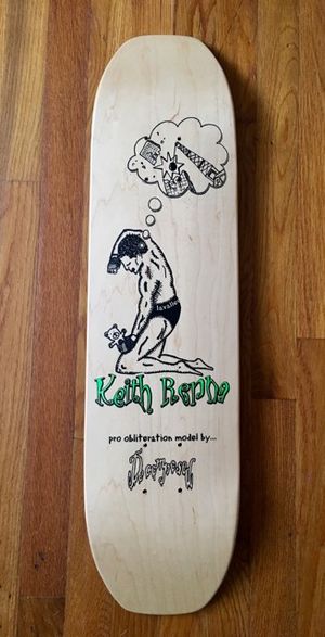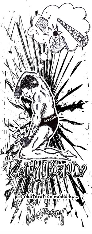 Features an MMA fighter just about to pummel a teddy bear that he is holding in his left hand against his left thigh. "lavallee" is printed across his waistband, in reference to Francis Lavallee. A thought-bubble shows a wrecking ball destroying a building. "Keith Renna" is printed in green letters below. "pro obliteration model by..." is printed in small bold black letters with the Decomposed logo below between the rear mounting holes.