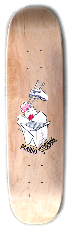 | Graphics | Features a person's right hand grasping a Hello Kitty with a pair of chopsticks, which has just been extracted from a Chinese take-out container. "MARIO STEINEMANN" is written along the bottom of the two front angles of the container. |