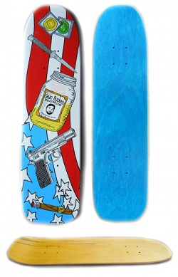| Graphics | Features an American flag background with various items symbolic of freedom and the American way. Starting from nose to tail, two condoms (one yellow and one green), a traditional stiletto switchblade, a large canning jar labeled "Sean Burke's moonshine" which is half full of what looks to be Sean Burke's yellow urine (Rich with Vitamin B, and possibly methanethiol depending on when he ate asparagus last), a stainless steel .45 caliber 1911, and a lit cigar with a red hot cherry. |