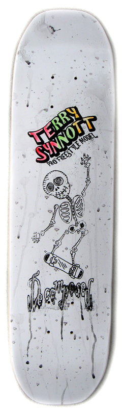 | Graphics | Features Terry's skeleton doing a No-Handed 50/50 Truckstand center-board. "TERRY SYNNOTT" is written in bold red, green and yellow filled letters above. "PRO FREESTYLE MODEL" is written in smaller solid black letters. The "Decomposed" logo appears below the skeleton. The background is whitish gray with black drips and runs throughout. |