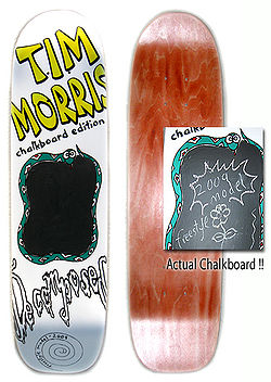 | Graphics | Features an actual chalkboard center board. The chalkboard is bordered with a light-green snake with white diamonds (rhombus) with a red center. The nose has "TIM MORRIS" in large yellow fill bold lettering with "chalkboard edition" written in smaller black letters underneath. The "Decomposed" logo spans the width of the deck over the rear mounting holes. A clockwise turning Archimedean spiral is featured on the tail with "freestyle model - 2009" written inside the left outer curve. The center appears to have to dots for eyeballs. |