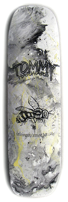 | Graphics | Features a large wasp facing right over a black, grey and yellow smeared paint background. "Tommy Harward Freestyle Model" is written above and "deliciousskateboardshop.com" is written below in black letters. |
