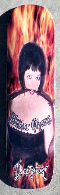 | Graphics | Features a sadistic black-haired woman wearing a black corset and holding a whip in her mouth. The background is black with the eternal flames of hell burning behind her. "Witter Cheng" is printed across her chest in a cool Old-English type font and the Decomposed logo appears on the tail. |