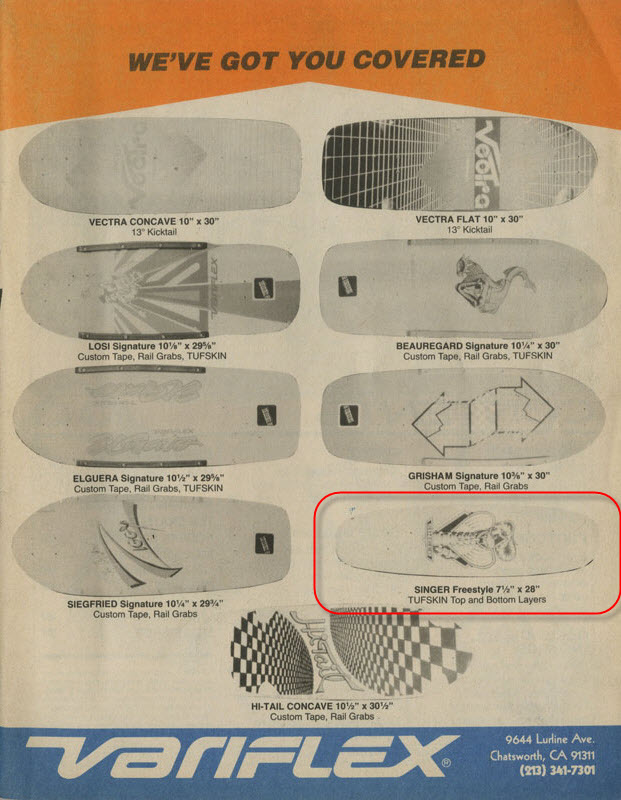 Variflex magazine ad with Variflex Stuart Singer Deck highlighted, circa 1984.