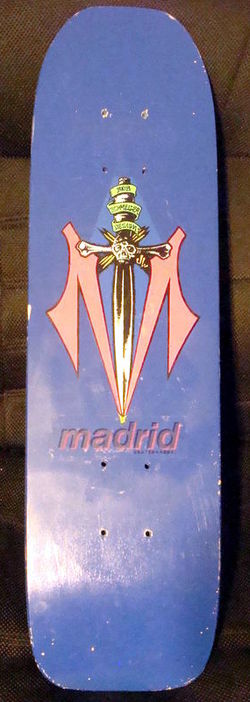| Graphics | Features a dagger with a skull and bone guard over a large pink "M". A yellow ribbon spirals around the handle three times with the words "BOB, SCHMELZER, DESIGN" printed on it. "madrid" is printed below in solid purple letters with a pink drop shadow. Decomposed made a deck for Keith Renna based on these graphics sometime before 2010. It was the Decomposed Keith Renna Dagger Deck. |