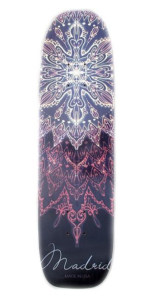 Features Madrid's "Mandala" graphic. The elaborate geometric pattern of a mandala centers on the front Mounting Holes and expands out in bright illuminating colors, darkening like fire as it goes. The point of the bottom outer edge of the pattern extends just past the rear mounting holes. "Madrid" is printed in white cursive lettering and "MADE IN USA" is printed in small uppercase letters just below.