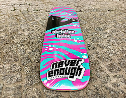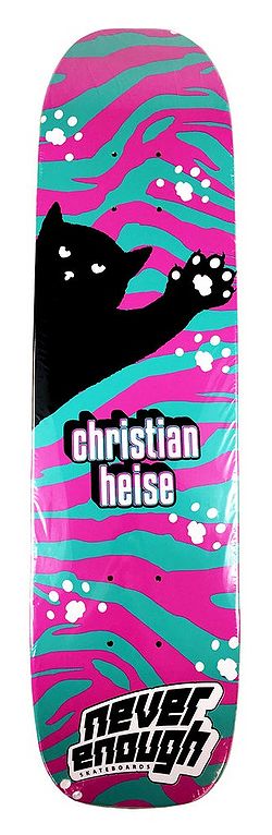 | Graphics | Graphics feature a black cat raising its front left paw in the air over a teal and magenta striped background. 7 white paw-prints are spread throughout the graphic. "christian heise" is printed in white 3D letters below the cat. The Never Enough Skateboard logo appears on the tail. |