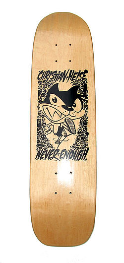 | Graphics | Features a cat with a bad attitude doing a Saran Wrap with sharp teeth showing on the left side of his mouth. He is wearing a white t-shirt and black shorts with his right foot in the air doing the Saran Wrap. There is a rectangular boarder of skulls and stuff around the cat. "CHRISTIAN HEISE" is printed above and "NEVER ENOUGH" printed below the cat. |