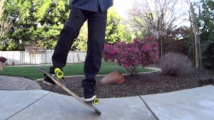 A No-Handed 50/50 is the No-Handed brother of the regular 50/50. Just like the regular 50/50, you most commonly get into it from a nose stop. You place your back foot under the deck in-between the trucks and lift the deck vertically. As the board reaches a little past a vertical position, rest your rear foot onto the truck and as deck comes over slide your front foot up under the grip tape side of the deck, until your front foot stops just below the nose, and you come to rest at a natural balancing point. Once balanced, you should be able to hold it for a second or so before doing a half-flip out, or other transitional trick. The whole process should be one fluid motion without touching your feet on the ground.