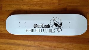 This model came in two different graphics; the first features a sick looking skull with the OutLook logo to the right of it with "FLATLAND SERIES" printed below. All graphics are black on a solid white background. The second generation featured a simpler graphic with a wide red stripe racing lengthwise down the middle (a little offset) of the deck. "OUTLOOK" is printed in black bold uppercase letters. "Flatland Division" is printed just below, to the right, in white letters.