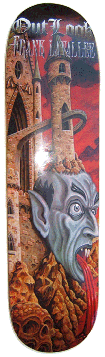 | Graphics | Features a huge balding vampire head with pointy ears stuck to the side of a castle, puking blood out into a river of blood. A tower is also sprouting from the vampires head. "OUTLOOK" and "FRANK LAVALLEE" is printed on the nose, in a really cool old English font. This graphic was part of a unique double set. The right side of the whole graphic was on this deck, and the left side was on the OutLook Terry Synnott Transylvania Towers Pro Model Deck. |