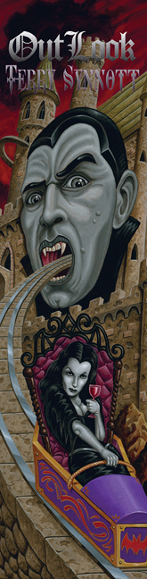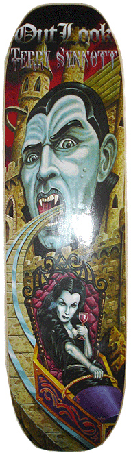 | Graphics | Features one of the most memorable graphics in freestyle history. A huge vampire head stuck to the side of a castle is puking out a roller coaster track, which has a hot busty vampire chick riding in a coffin-shaped car down the tracks, holding a glass of wine (or blood?). "OUTLOOK" and "TERRY SYNNOTT" is printed on the nose, in a super cool font. This graphic was part of a unique double set. The left side of the whole graphic was printed on this deck, and the right side was printed on the OutLook Frank Lavallee Transylvania Towers Pro Model Deck. |