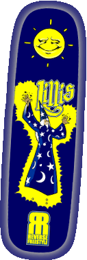 | Graphics | Features your stereotypical wizard with long robe with a crescent moon and star pattern with matching cone hat. The wizard is electrified with a yellow magic aura, with "Lillis" written in big yellow letters floating above him. A yellow smiling full moon is radiating 8 rays of light in all directions on the nose and the Reverse Freestyle logo is printed on the tail. |