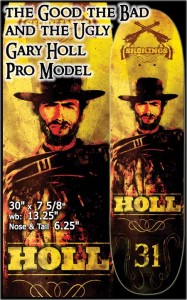 | Graphics | Features "The Man With No Name" (Character) from The Good, the Bad and the Ugly (1966) played by Clint Eastwood. Two pistols with barrels crossed and the "SK8KINGS" printed across the handles appears on the Nose. "HOLL" is printed in yellow block letters just above the rear truck. A large number "31" is printed in yellow on the Tail. |
