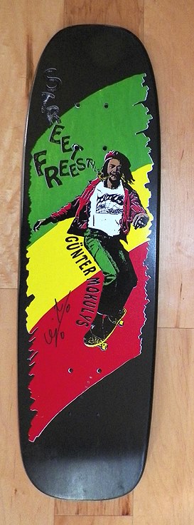 The graphic features Peter Tosh wearing a Titus shirt and riding a skateboard (instead of a unicycle), over a thick-striped background of the Rastafari flag colors. He also has a pipe in his mouth with the words "STREETSTYLE" and "FREESTYLE" emanating from the pipe like smoke. The "STREET" and "FREE" words converge into a single "STYLE". "GÜNTER MOKULYS" is printed along the left side of his leg, along the bend of his knees and buttocks.