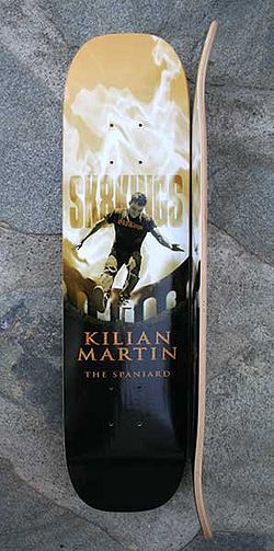 | Graphics | Features Kilian standing on the nose in a No-Hand 50/50 in front of a series of arches on a yellow sky background.The bottom half of the board is black. Behind Kilian, reads "SK8KINGS" in large letters. Below reads "KILIAN MARTIN", "THE SPANIARD" in gold letters. |