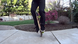 A '''No Handed Pogo''' is performed with the board straight up against your legs, with one foot on the bottom truck and the top truck hanger against your calf. Once in this position, you hop as if on a pogo stick. The other foot usually presses on the grip tape side of the board for grip. | A '''No Handed Pogo''' is performed with the board straight up against your legs, with one foot on the bottom truck and the top truck hanger against your calf. Once in this position, you hop as if on a pogo stick. The other foot usually presses on the grip tape side of the board for grip. | ||