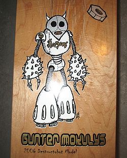 | Graphics | Feature a destructive-looking robot center-board. The robot is sporting spiked forearms, pincher claws, rockets in it's feet and horns on its head. A skull is printed on its shoulders and the Decomposed logo appears on its torso. Three silver nuts and bolts each are randomly spread throughout the background. "GUNTER MOKULYS" appears below the robot in large gold letters with a black outline, and "2006 Destructobot Model" is written in black letters below the name. Metallic glitter ink was used for portions of these graphics. |