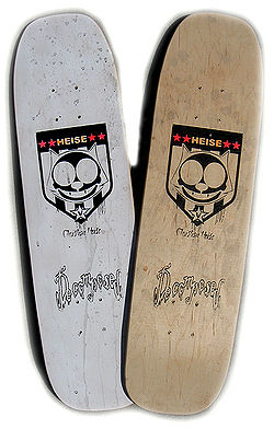 | Graphics | Features a badge that goes down to a point with "HEISE" written on a black bar across the top with two red starts of both sides. A cat's smiling face is inside the badge. There is a star with the letter "V" in at down at the point. "Christian Heise" is written below in black letters. The Decomposed logo appears just above the rear truck mounting holes. The grey board has paint splatter and runs throughout. |