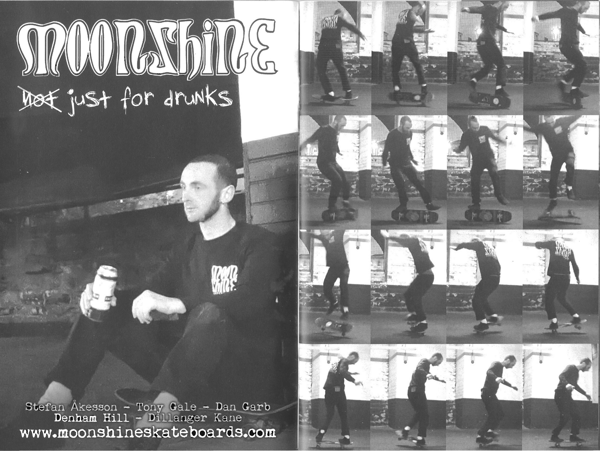 Moonshine Skateboards "not just for drunks" Ad, Featuring Denham Hill and his Meatspin. Printed in Broken Fingers Magazine - Issue 06, May 2016.