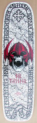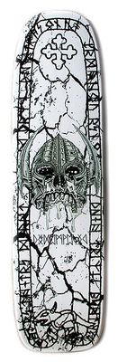 The graphics are a Decomposed reproduction of the classic Powell Peralta Nordic Skull graphics. The primary differences are that the skull's lower jaw has been ripped off, with blood dripping off, and some of the upper teeth are broken or missing. The runic letters around the contour of the board have also been modified. "Decomposed" is written in runic letters below the skull.